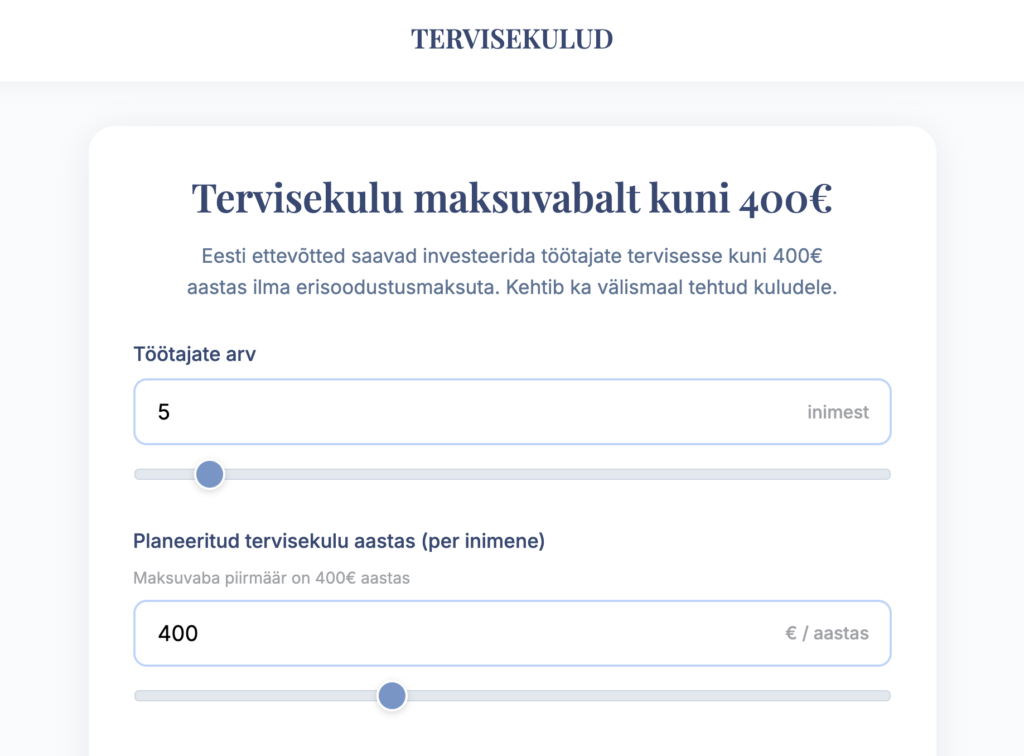 Tervisekulude kalkulaator / Raamatupidamine / By RaamatupidajaTriin Tegin tervisekulude kalkulaatori, mis aitab kiiresti kontrollida:millised kulud üldse tervisekulude alla lähevad,mis ulatuses saab kulusid maksuvabalt hüvitada,kui suur on erisoodustusmaksud, kui ületada piirmäära,kus deklareerida tervisekulusid?Kui sul on töötajaid või plaanid iseendale tervise- ja spordikulu hüvitamist, siis see säästab päris palju aega. Kui vajad abi raamatupidamisega, siis kirjuta triin@triinparn.com KALKULAATOR